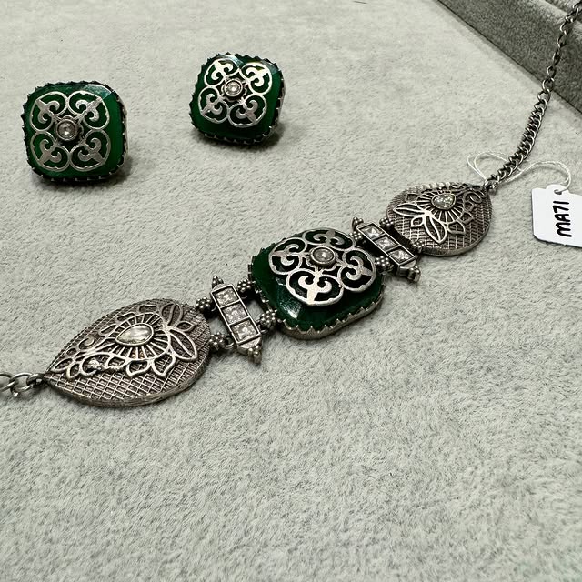 Turn heads with our Oxidised Silver and Emerald Green Choker Set, a perfect fusion of traditional charm and contemporary elegance. The intricate oxidised silver detailing is beautifully paired with vibrant emerald green accents, making it a statement piece for any occasion.